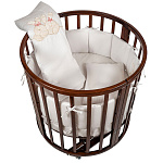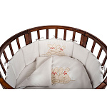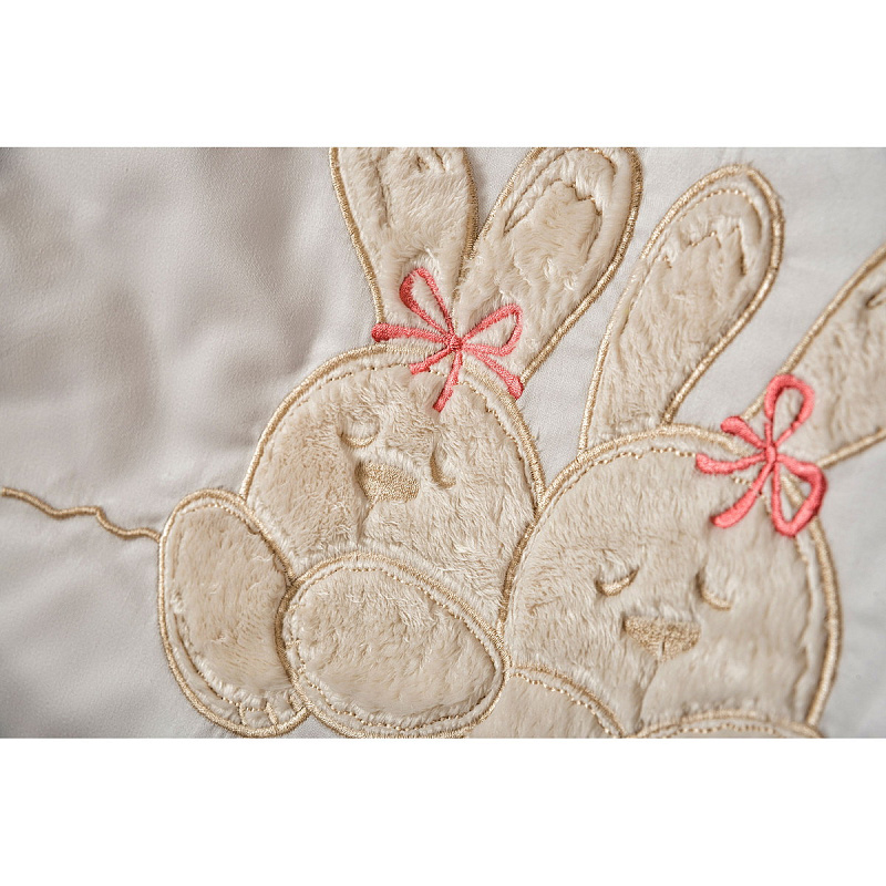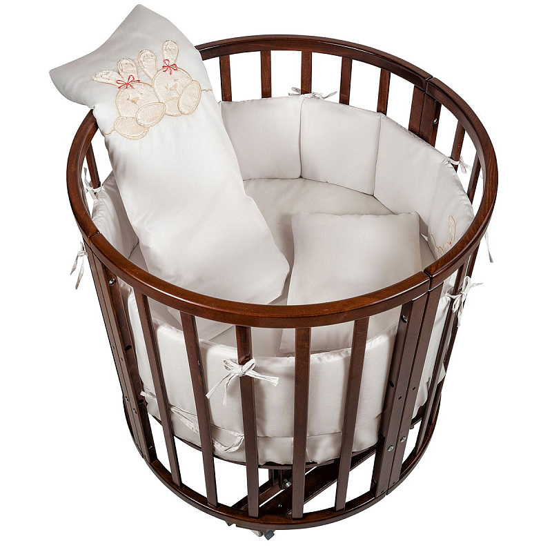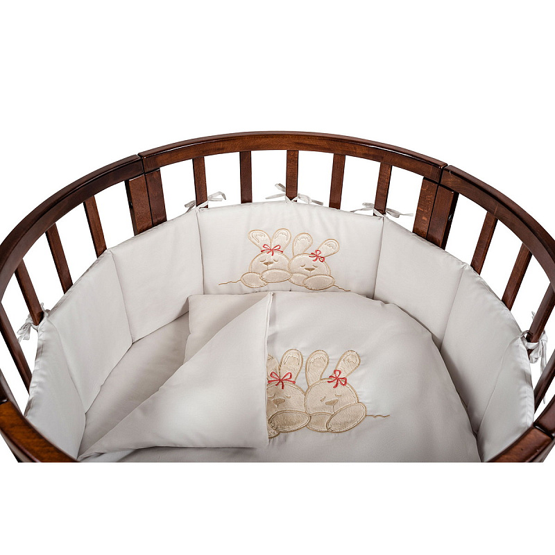 Украшен красивой вышивкой в виде маленьких милых зайчиков и предназначен для колыбелек с круглыми матрасиками.