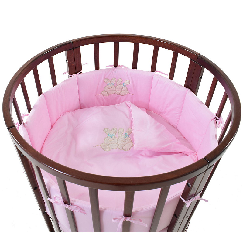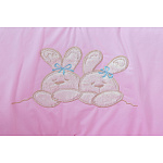 Украшен красивой вышивкой в виде маленьких милых зайчиков и предназначен для колыбелек с круглыми матрасиками.