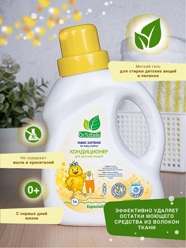 Кондиционер для стирки детских вещей Dr.Tuttelle подходит для всех типов тканей. Сохраняет цвет и структуру волокон, предотвращает потерю формы одежды. Безопасен для стирки белья малышей и людей с чувствительной кожей. Эффективно удаляет остатки моющего средства из волокон ткани. Облегчает глажку. Снимает антистатический заряд.