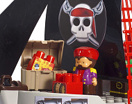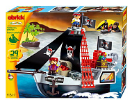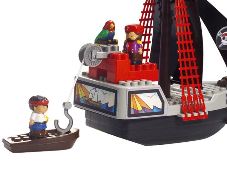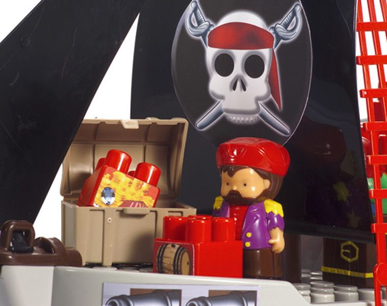 Игровой набор включает в себя 29 деталей: большой корабль (49 х 19 х 35 см), лодку, сундук с сокровищами, пиратов и блоки для конструирования.