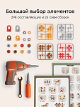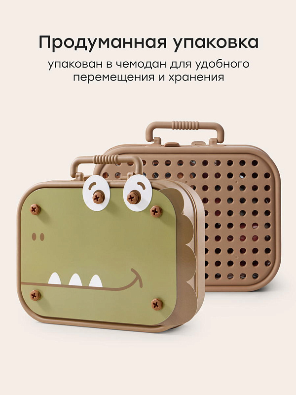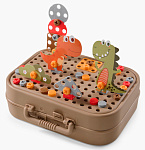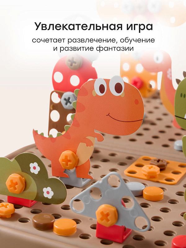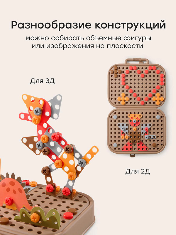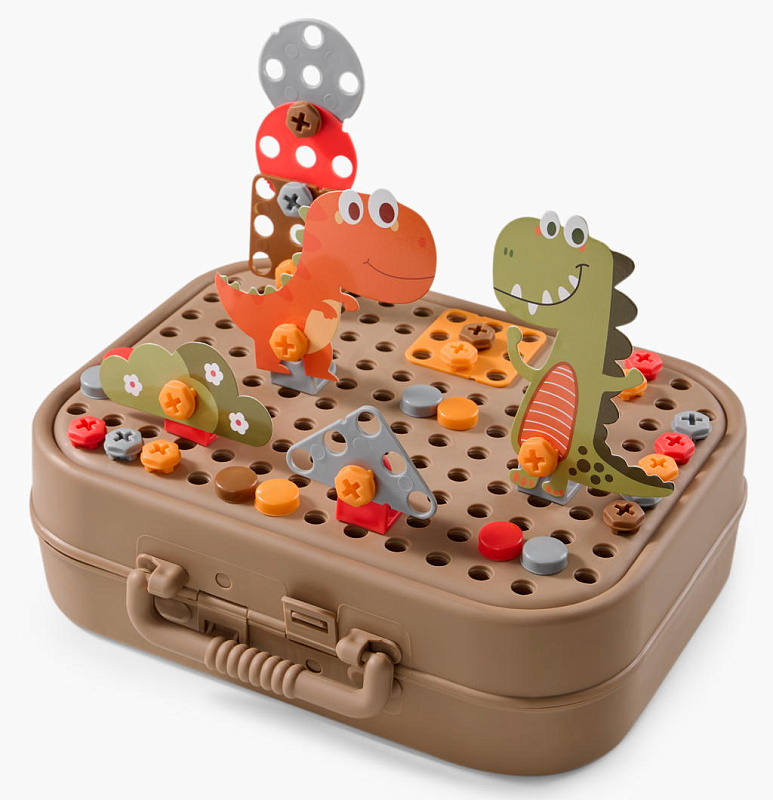 Детский конструктор с шуруповёртом - набор для сборки разнообразных конструкций в виде динозавров, объединяющий игру и обучение. В комплекте 298 деталей, аккуратно уложенных в кейс, который превращается в площадку для сборки. Яркие карточки в виде динозавров встраиваются в модели и придают им завершённый вид.