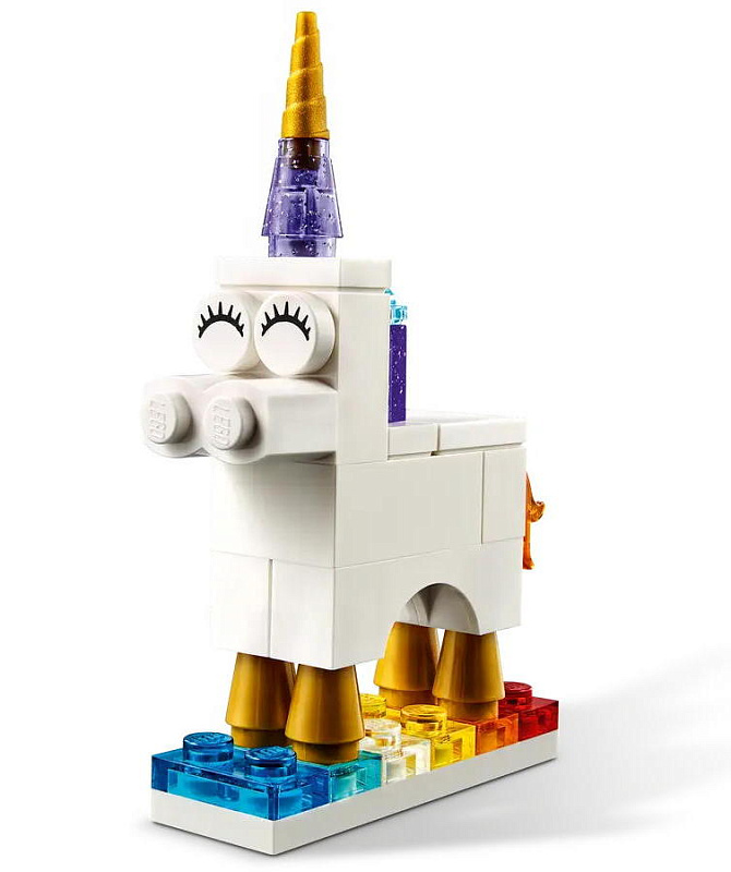 Что в коробке? Всем детям нужно собрать игрушечную птицу, льва, черепаху, робота, единорога, розовую птицу, волшебника со столом для зелий и рыбу в коралловом окружении, а также дополнительные кубики LEGO® для еще большего творческого веселья!