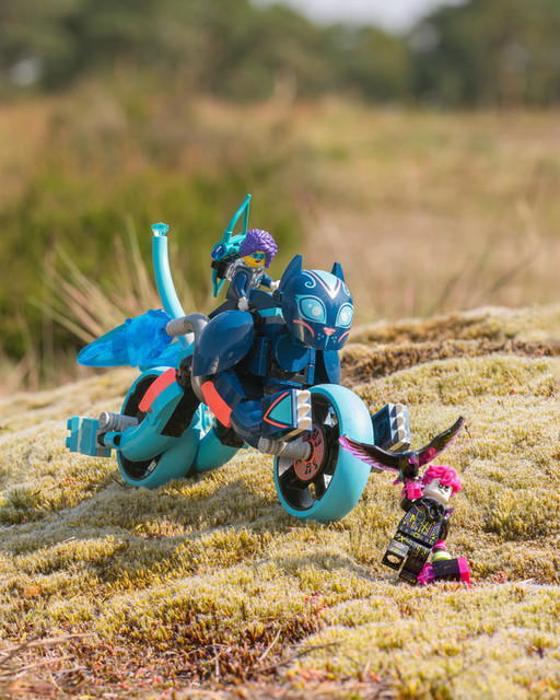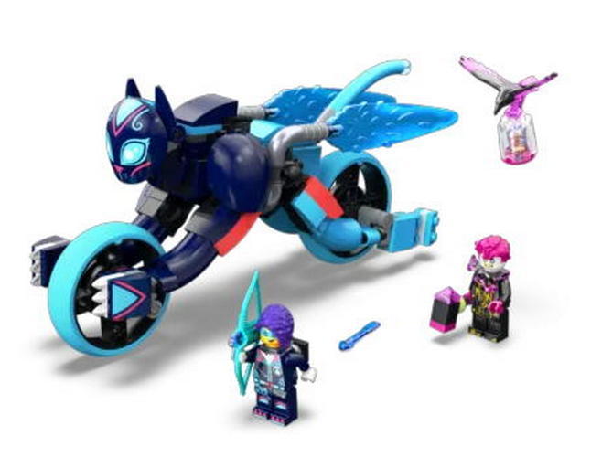 Приключение LEGO DREAMZzz Зои приземлилась в мире снов, и ворон Никогда-ведьмы напал, чтобы украсть одно из ее воспоминаний! Пусть начинающие охотники за мечтами спасут день и помогут Зои вернуть его с этим полным действий игровым набором. С 2 вариантами сборки на выбор дети будут в восторге от сборки подвижного кота, прежде чем превратить его в потрясающий котобайк с колесами или скоростного игрушечного кота с турбоускорителями. Котобайк преследует злого ворона Никогда-ведьмы, в то время как скоростной кот отбивается от него.