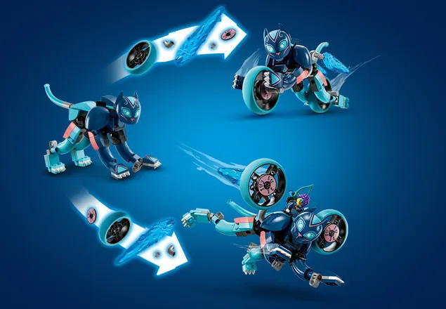 1 игрушка, 2 творческие модели — дети будут в восторге от открытия 2 захватывающих вариантов сборки; они могут создать котобайк с вращающимися колесами, а затем перестроить его в скоростного кота с турбоускорителями.