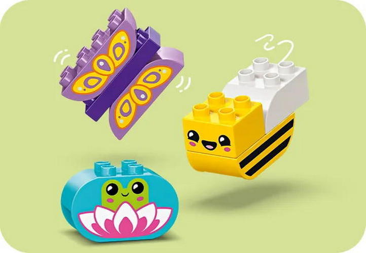 Включает в себя 3 фигурки животных LEGO® DUPLO®. Этот набор для детей дошкольного возраста включает в себя 3 фигурки: лягушку, бабочку и пчелу.