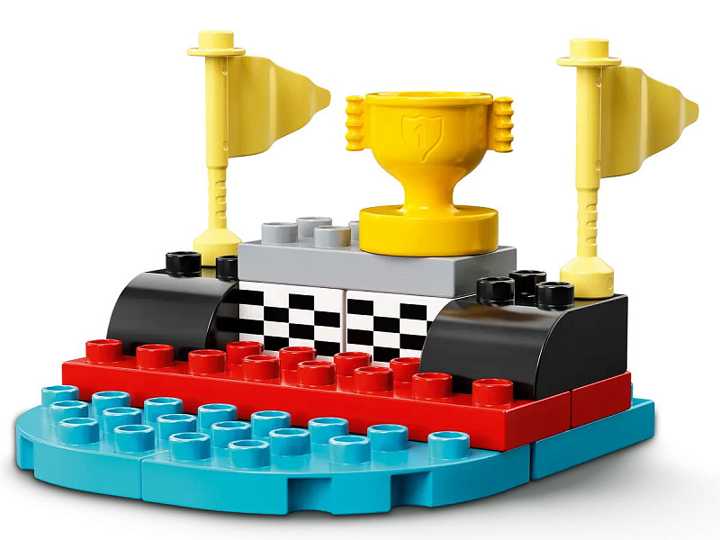 В набор входят фигурки гонщиков DUPLO® мужского и женского пола в шлемах, 2 автомобиля-толкателя и аксессуары, в том числе кубок, флаги, зарядное устройство для электромобиля, конусы и инструменты для ухода за автомобилем.