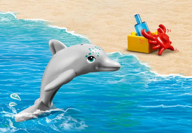 Обучающая игрушка для юных строителей. Малыши могут попрактиковаться в навыках строительства, прежде чем придумывать истории для друзей, гоняющих на водных скутерах и пытающихся найти дельфина.