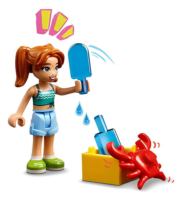 Оживите историю – в этот конструктор для детей входят аксессуары, в том числе солнцезащитный крем, бинокль, ракушка, морская звезда, спасательный жилет и спасательный круг, а также краб, который любит воровать мороженое.