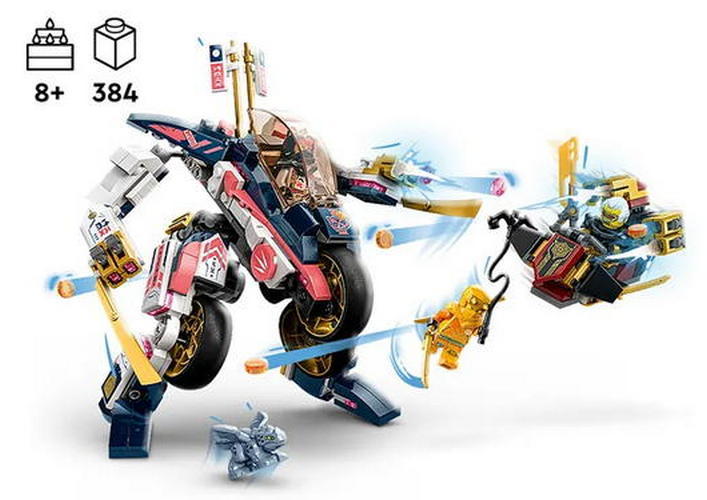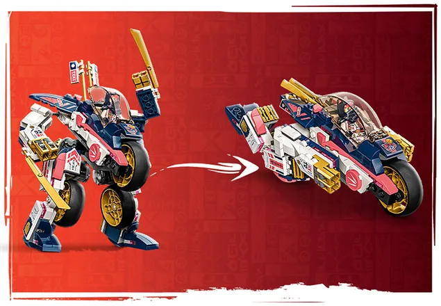 Робот и мотоцикл LEGO® NINJAGO® – дети в возрасте от 8 лет и старше могут воссоздать свои любимые сцены из мультсериала NINJAGO Dragons Rising с игровым набором «Трансформирующийся робот-мотоциклист Соры» (71792)
