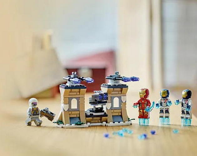 В набор входят 4 минифигурки: Железный человек, 2 Железных легионера и солдат Гидры. Сборная игрушка Железный человек имеет открывающийся забрало и держит мощный бластер. Солдат Гидры имеет шутер. Прозрачные синие кубики включены, чтобы создать впечатление, что минифигурки летают. Сборная база Гидры имеет 2 шутера, прикрепленных к вращающемуся полу, где дети могут расположить солдата Гидры, чтобы нацеливаться на приближающихся супергероев. На вершине башен базы находятся 2 пары ракетных установок (не стреляющих) для отражения атак. Доступ к дополнительным цифровым функциям можно получить через приложение LEGO Builder.