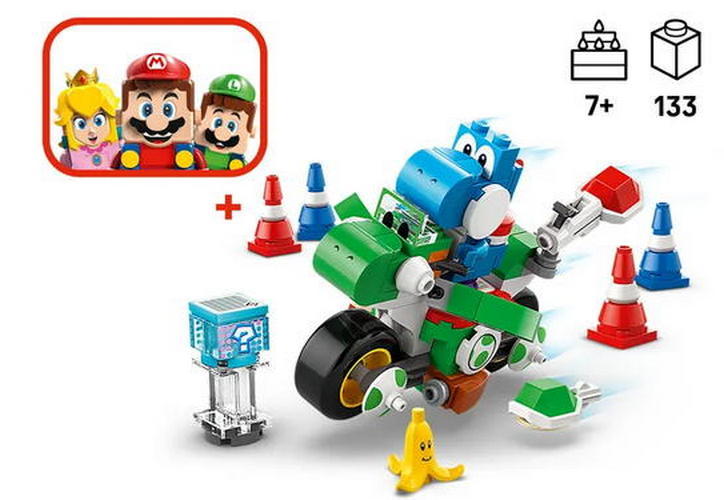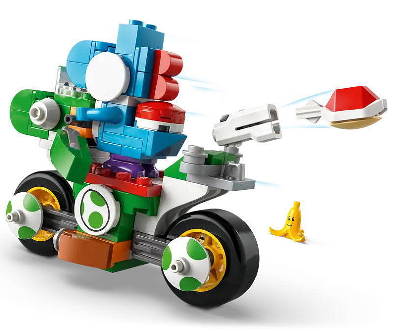 Игрушка «Йоши-байк» — поместите светло-голубого Йоши на Йоши-байк и проезжайте между 4 дорожными конусами, стреляйте снарядами с велосипеда и объезжайте банан.