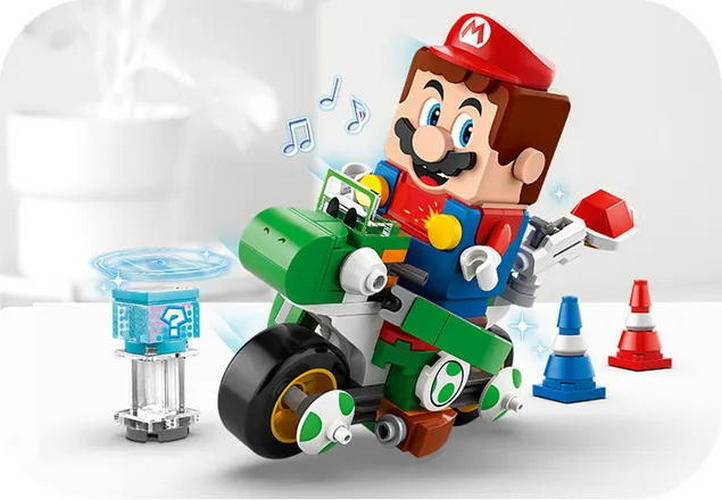 Интерактивная игра — катайтесь на мотоцикле Йоши с LEGO® Mario™, LEGO® Luigi™ или LEGO® Peach™ (фигурки не входят в комплект), чтобы активировать звуковые и визуальные эффекты Mario Kart™ и получить цифровые предметы из ящика с предметами.