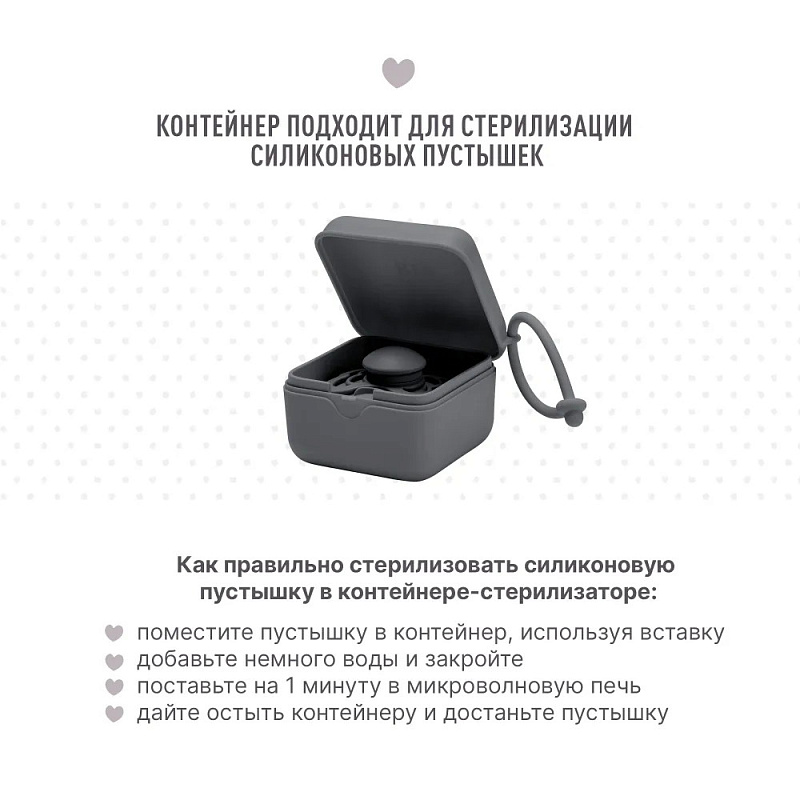 *Для стерилизации силиконовых пустышек необходимо добавить 2 столовых ложки холодной воды в контейнер и поставить его в микроволновую печь на 60 секунд при максимальной мощности 600 Вт. Температура не должна достигать 100°С. После стерилизации нужно дать остыть контейнеру пару минут, и пустышка снова готова к использованию.