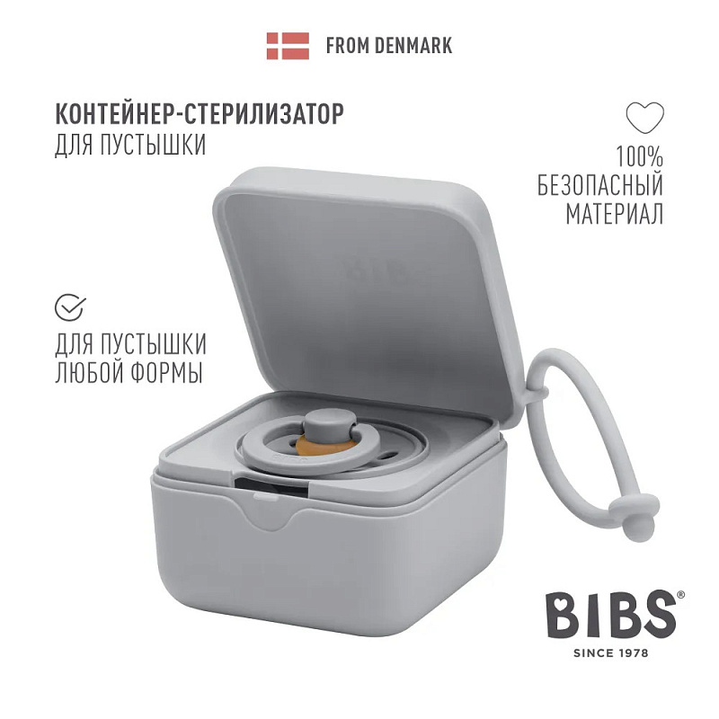 Аксессуар стильно смотрится на сумке или коляске. Контейнер поставляется со специальной съёмной вставкой, с помощью которой можно закрепить внутри одну пустышку BIBS любой формы. Без вставки контейнер вместит уже три пустышки BIBS или одну пустышку с держателем.