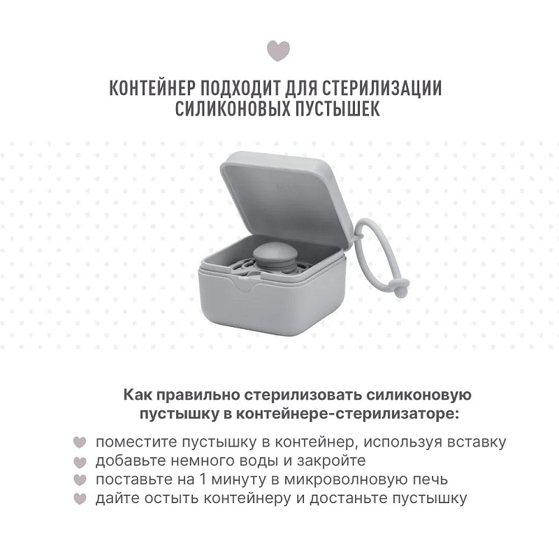 *Для стерилизации силиконовых пустышек необходимо добавить 2 столовых ложки холодной воды в контейнер и поставить его в микроволновую печь на 60 секунд при максимальной мощности 600 Вт. Температура не должна достигать 100°С. После стерилизации нужно дать остыть контейнеру пару минут, и пустышка снова готова к использованию.