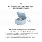 *Для стерилизации силиконовых пустышек необходимо добавить 2 столовых ложки холодной воды в контейнер и поставить его в микроволновую печь на 60 секунд при максимальной мощности 600 Вт. Температура не должна достигать 100°С. После стерилизации нужно дать остыть контейнеру пару минут, и пустышка снова готова к использованию.