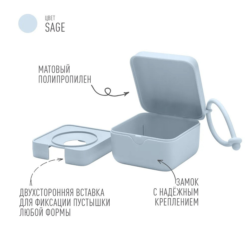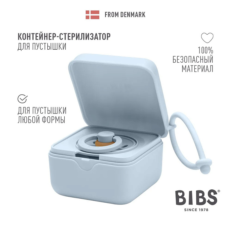 Аксессуар стильно смотрится на сумке или коляске. Контейнер поставляется со специальной съёмной вставкой, с помощью которой можно закрепить внутри одну пустышку BIBS любой формы. Без вставки контейнер вместит уже три пустышки BIBS или одну пустышку с держателем.