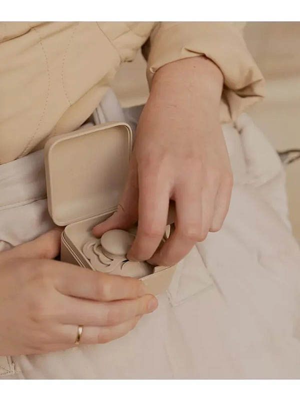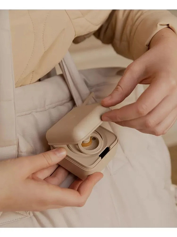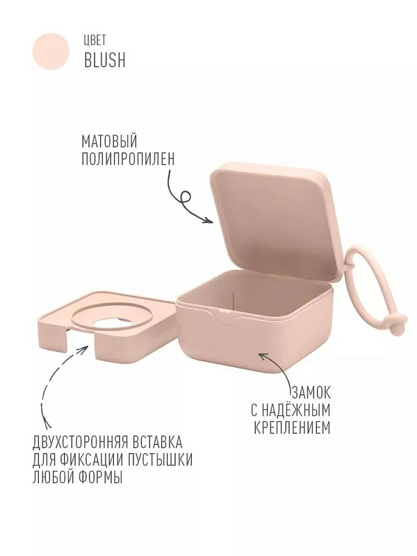 Аксессуар стильно смотрится на сумке или коляске. Контейнер поставляется со специальной съёмной вставкой, с помощью которой можно закрепить внутри одну пустышку BIBS любой формы. Без вставки контейнер вместит уже три пустышки BIBS или одну пустышку с держателем.