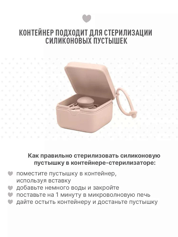 *Для стерилизации силиконовых пустышек необходимо добавить 2 столовых ложки холодной воды в контейнер и поставить его в микроволновую печь на 60 секунд при максимальной мощности 600 Вт. Температура не должна достигать 100°С. После стерилизации нужно дать остыть контейнеру пару минут, и пустышка снова готова к использованию.