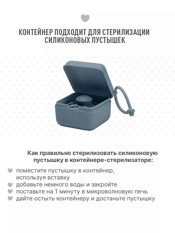 *Для стерилизации силиконовых пустышек необходимо добавить 2 столовых ложки холодной воды в контейнер и поставить его в микроволновую печь на 60 секунд при максимальной мощности 600 Вт. Температура не должна достигать 100°С. После стерилизации нужно дать остыть контейнеру пару минут, и пустышка снова готова к использованию.