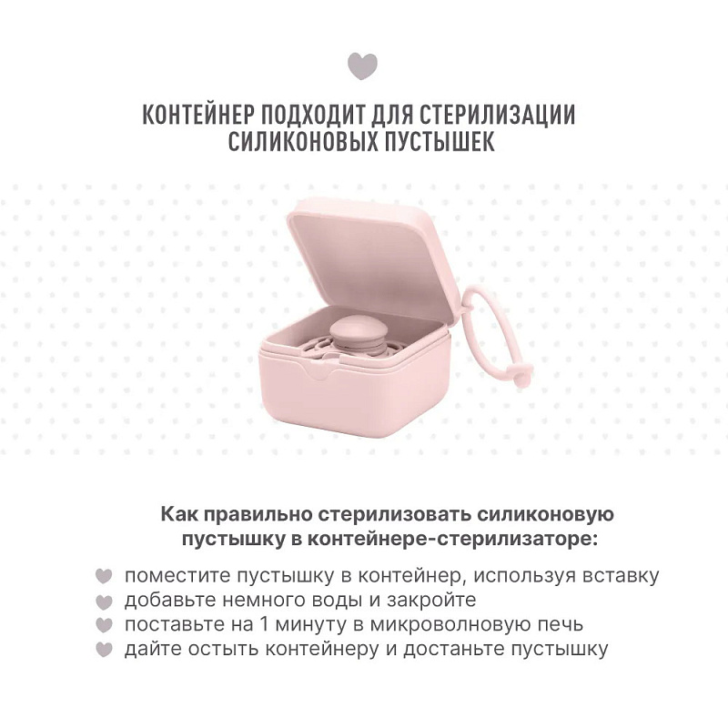 *Для стерилизации силиконовых пустышек необходимо добавить 2 столовых ложки холодной воды в контейнер и поставить его в микроволновую печь на 60 секунд при максимальной мощности 600 Вт. Температура не должна достигать 100°С. После стерилизации нужно дать остыть контейнеру пару минут, и пустышка снова готова к использованию.