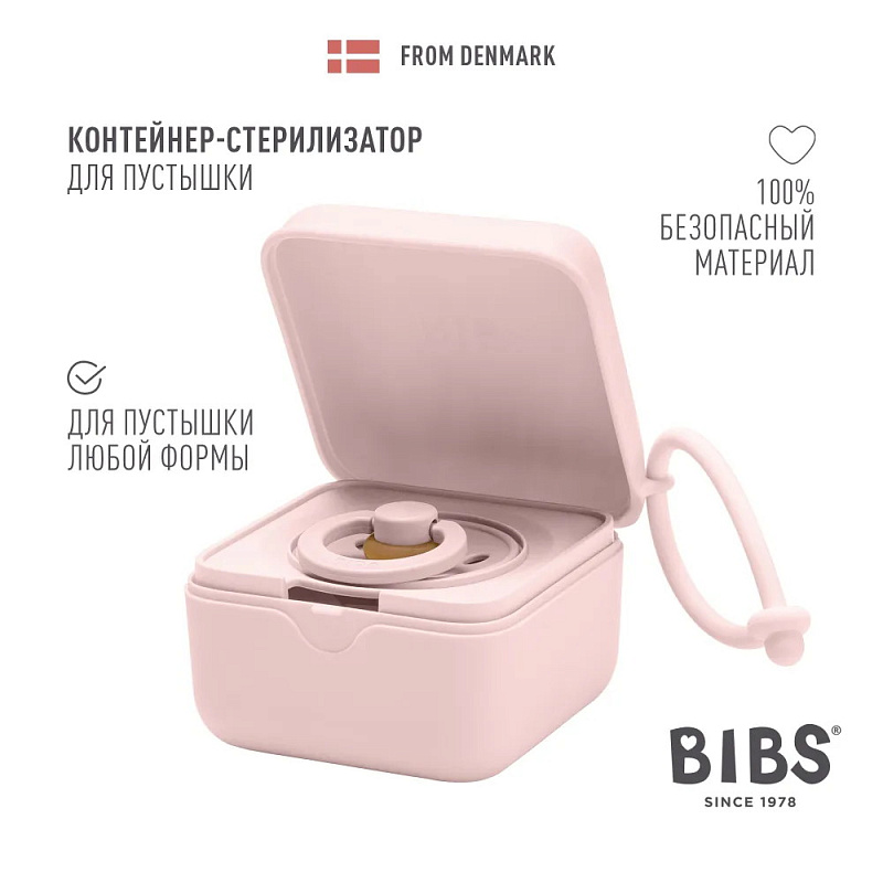 Аксессуар стильно смотрится на сумке или коляске. Контейнер поставляется со специальной съёмной вставкой, с помощью которой можно закрепить внутри одну пустышку BIBS любой формы. Без вставки контейнер вместит уже три пустышки BIBS или одну пустышку с держателем.