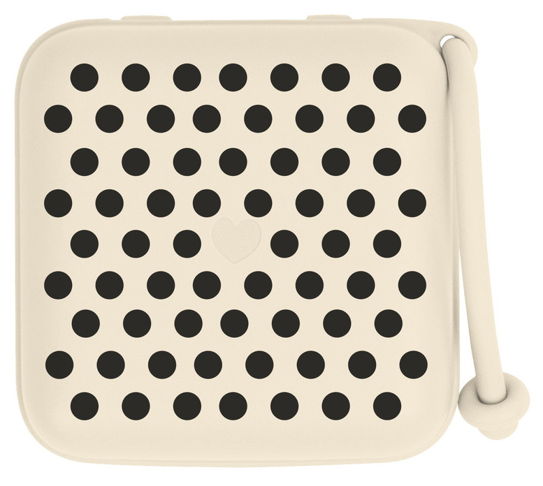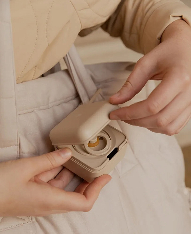 Аксессуар стильно смотрится на сумке или коляске. Контейнер поставляется со специальной съёмной вставкой, с помощью которой можно закрепить внутри одну пустышку BIBS любой формы. Без вставки контейнер вместит уже три пустышки BIBS или одну пустышку с держателем.