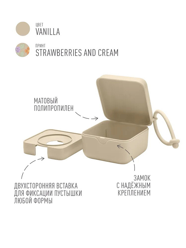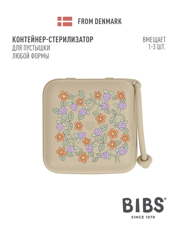 Контейнер поставляется со специальной съёмной вставкой, с помощью которой можно закрепить внутри одну пустышку BIBS любой формы. Без вставки контейнер вместит уже три пустышки BIBS или одну пустышку с держателем.
