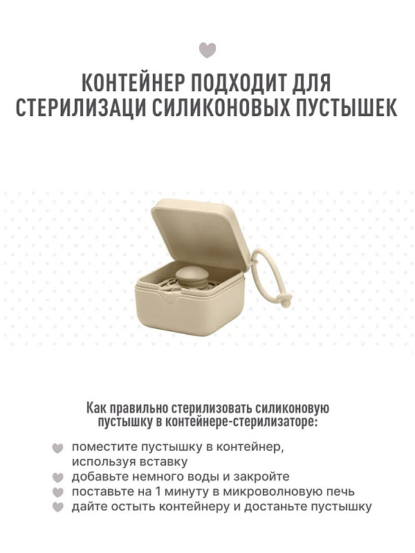 *Для стерилизации силиконовых пустышек необходимо добавить 2 столовых ложки холодной воды в контейнер и поставить его в микроволновую печь на 60 секунд при максимальной мощности 600 Вт. Температура не должна достигать 100°С. После стерилизации нужно дать остыть контейнеру пару минут, и пустышка снова готова к использованию.