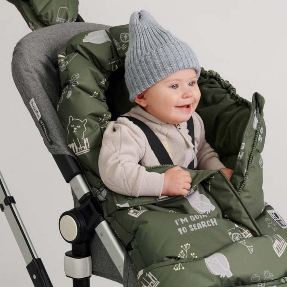 - утяжка капюшона с помощью регулируемого шнурка и защита от задувания на прорезях и молниях надежно сохраняют тепло внутри конверта