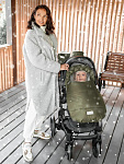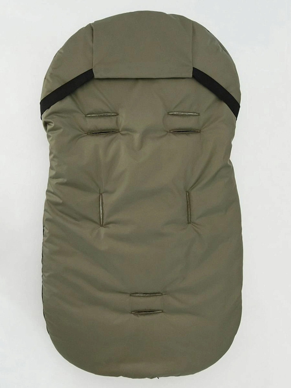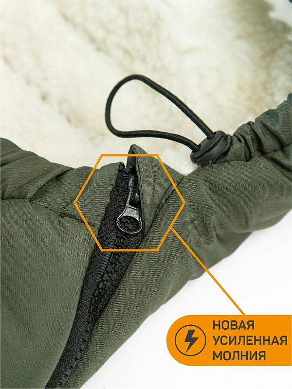 Конверт рассчитан на холода до -25 °С и состоит из трех защитных слоев: непромокаемого верха, плотного утеплителя и подкладки из меха с натуральной шерстью.