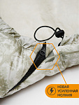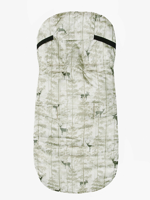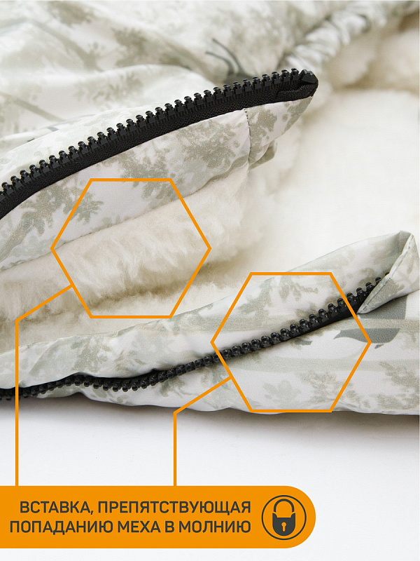 Конверт рассчитан на холода до -25 °С и состоит из трех защитных слоев: непромокаемого верха, плотного утеплителя и подкладки из меха с натуральной шерстью.