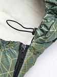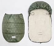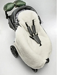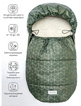 Конверт рассчитан на холода до -25 °С и состоит из трех защитных слоев: непромокаемого верха, плотного утеплителя и подкладки из меха с натуральной шерстью.