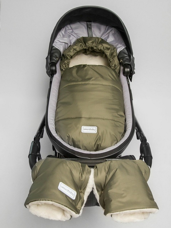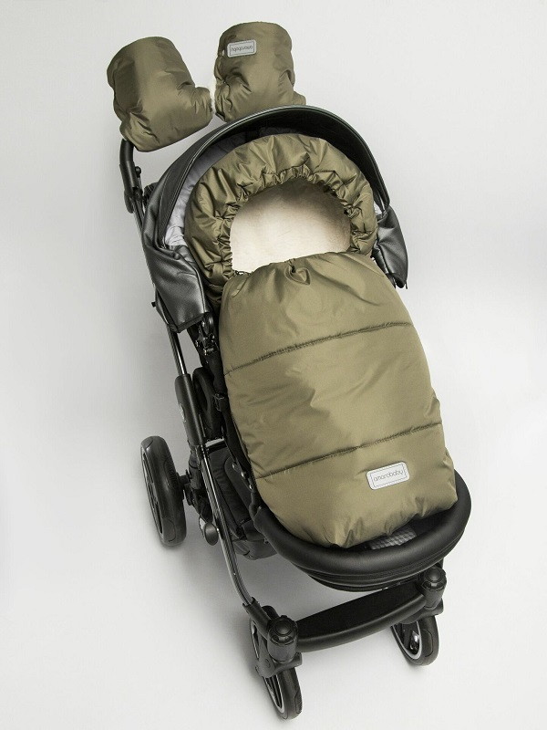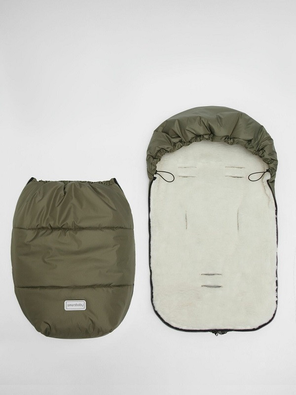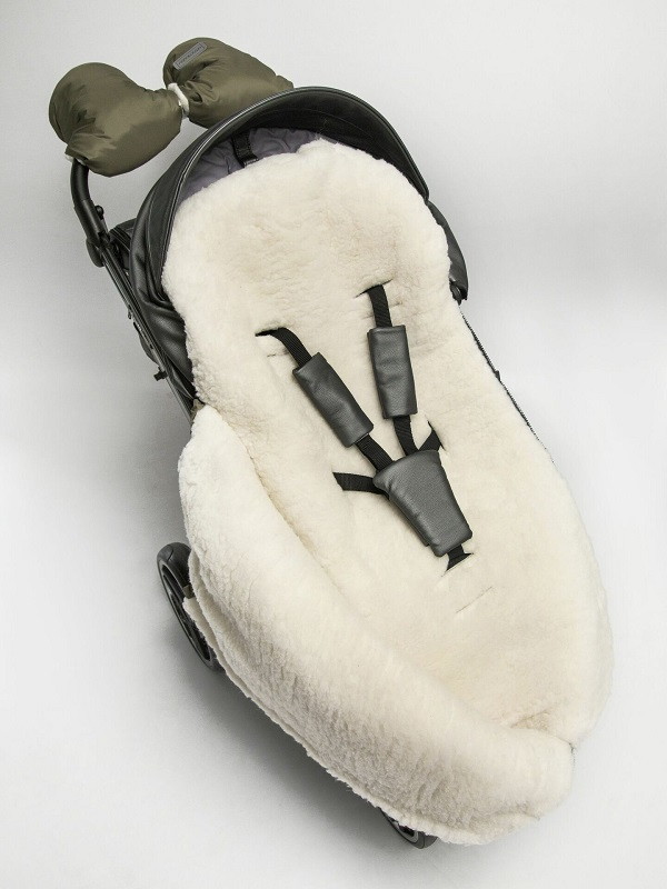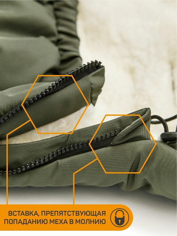 Конверт рассчитан на холода до -25 °С и состоит из трех защитных слоев: непромокаемого верха, плотного утеплителя и подкладки из меха с натуральной шерстью.