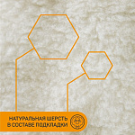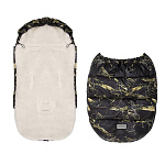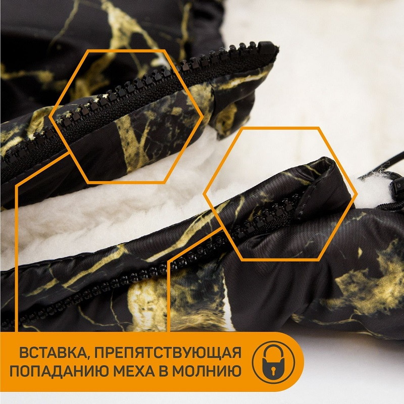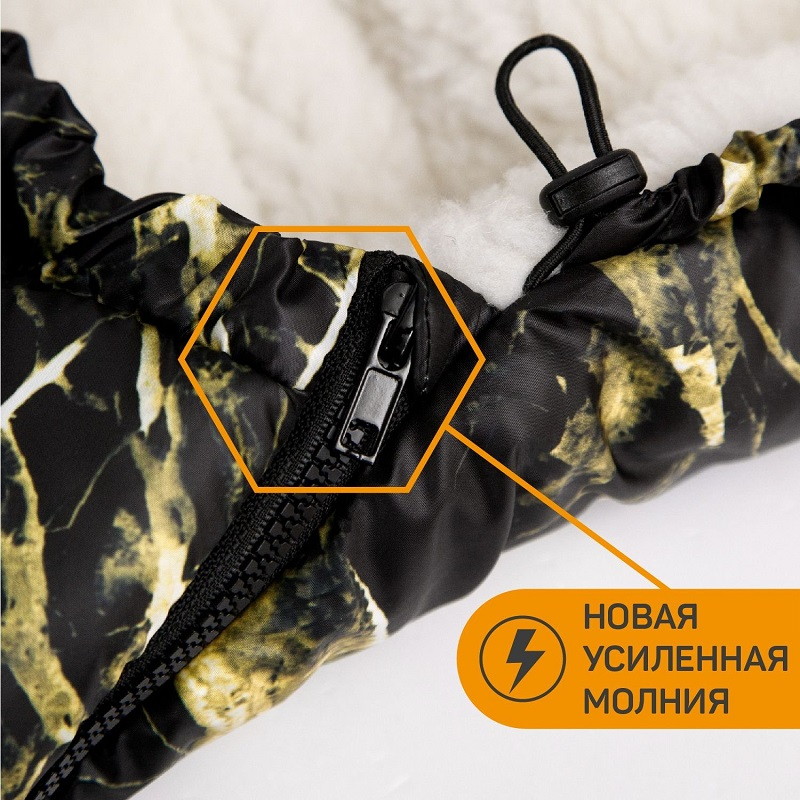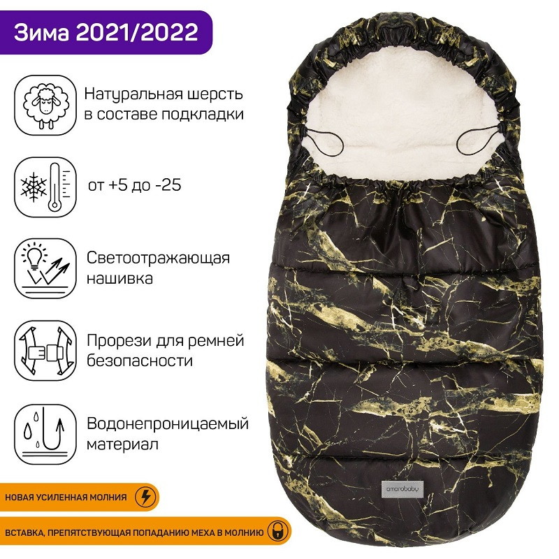 Конверт рассчитан на холода до -25 °С и состоит из трех защитных слоев: непромокаемого верха, плотного утеплителя и подкладки из меха с натуральной шерстью.