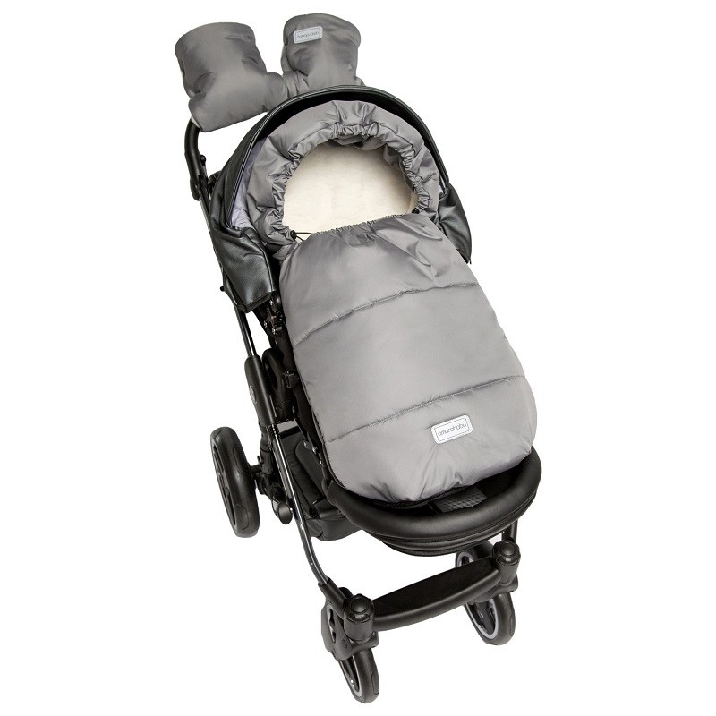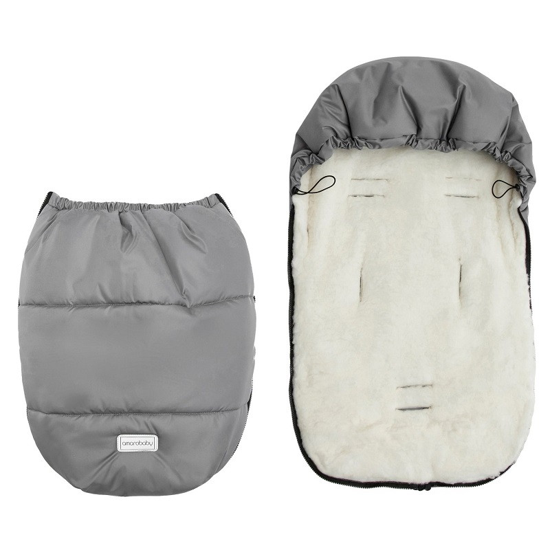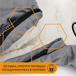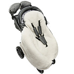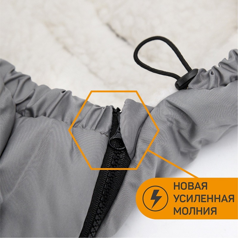 Конверт рассчитан на холода до -25 °С и состоит из трех защитных слоев: непромокаемого верха, плотного утеплителя и подкладки из меха с натуральной шерстью.