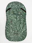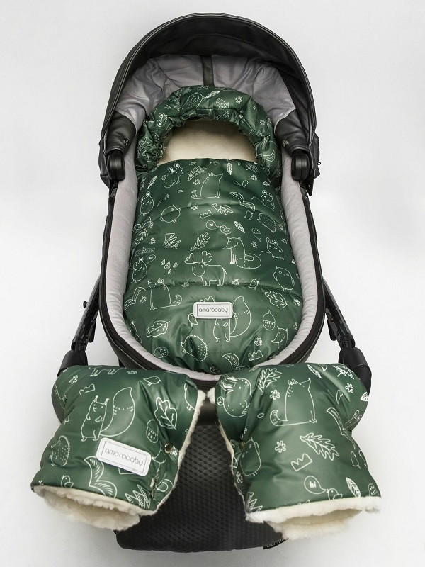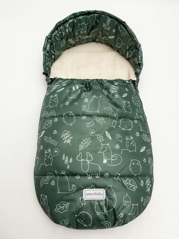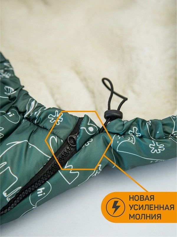 Конверт рассчитан на холода до -25 °С и состоит из трех защитных слоев: непромокаемого верха, плотного утеплителя и подкладки из меха с натуральной шерстью.