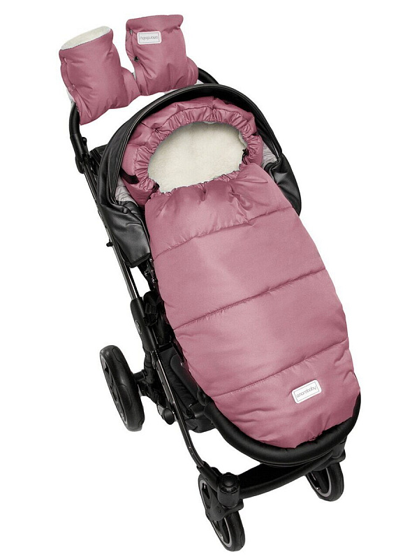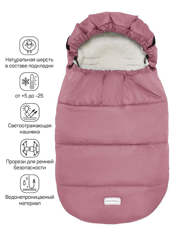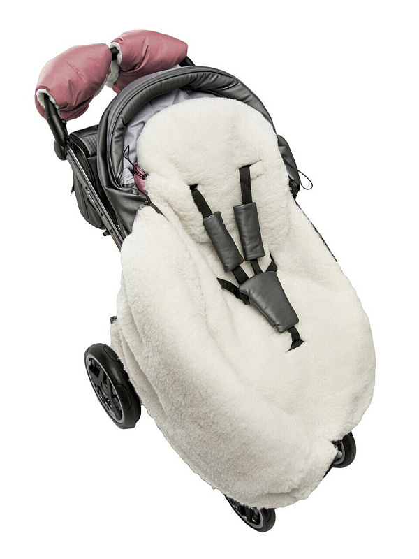 Конверт рассчитан на холода до -25 °С и состоит из трех защитных слоев: непромокаемого верха, плотного утеплителя и подкладки из меха с натуральной шерстью.