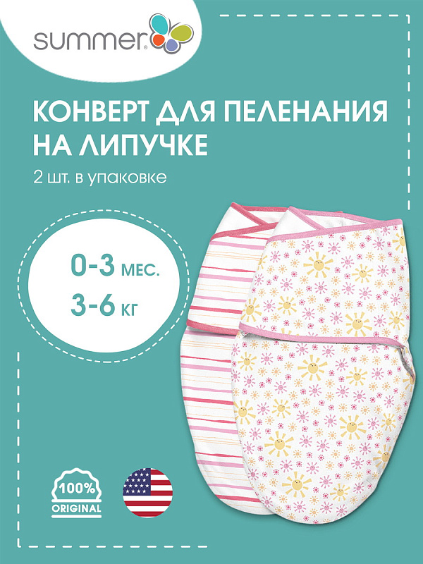 Конверт на липучке Summer Infant Swaddleme Luxe Whisper Quiet 2 шт р. S/M, розовые/желтые полоскиНет оценокХарактеристики