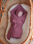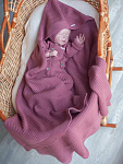 Шерстяной вязаный плед с капюшоном для новорожденных и малышей. Плед - конверт прекрасно подойдет для выписки из роддома, в комплект входит пояс - резинка украшенный бантом. Размер 95х95 идеально подойдет для кроватки, колыбельки и коляски. Прекрасное сочетание красивого дизайна и практичности. Такие пледы прекрасно подойдут для выписки малыша из роддома, укрывания малыша как дома в кроватке, так и на прогулке в коляске. Плед сохранит тепло, подарит комфорт даже самой продолжительной прогулке в прохладное время года. Состав: 100% шерсть мериноса