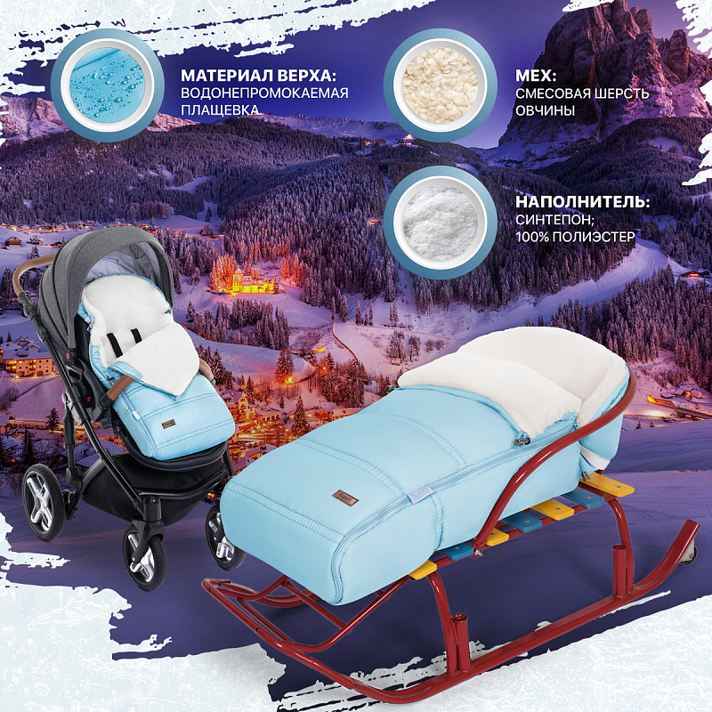 Основа конверта — смесовая овечья шерсть, которая имеет густой и теплый ворс высотой 12 мм. Благодаря природным качествам шерсти внутри конверта обеспечивается оптимальная терморегуляция. Слой синтепона создает дополнительную мягкую прослойку, не утяжеляя изделие (вес конверта всего 0,65кг).