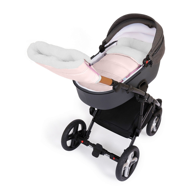 Нижнюю и верхнюю части изделия соединяют две разъемные спиральные молнии с пластиковыми фиксаторами, которые позволяют с удобством вынимать сонного малыша из мехового конверта после прогулки. Спинка конверта полностью отстегивается, поэтому впоследствии изделие можно использовать как коврик или накидку на ножки. Отверстия для пятиточечных ремней безопасности дают возможность пристегнуть ребенка в прогулочном блоке, а крепление за спинку коляски исключает сползание.