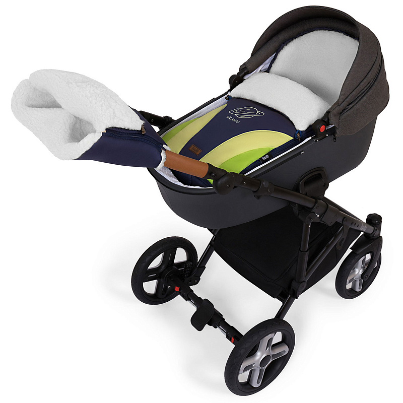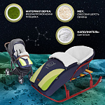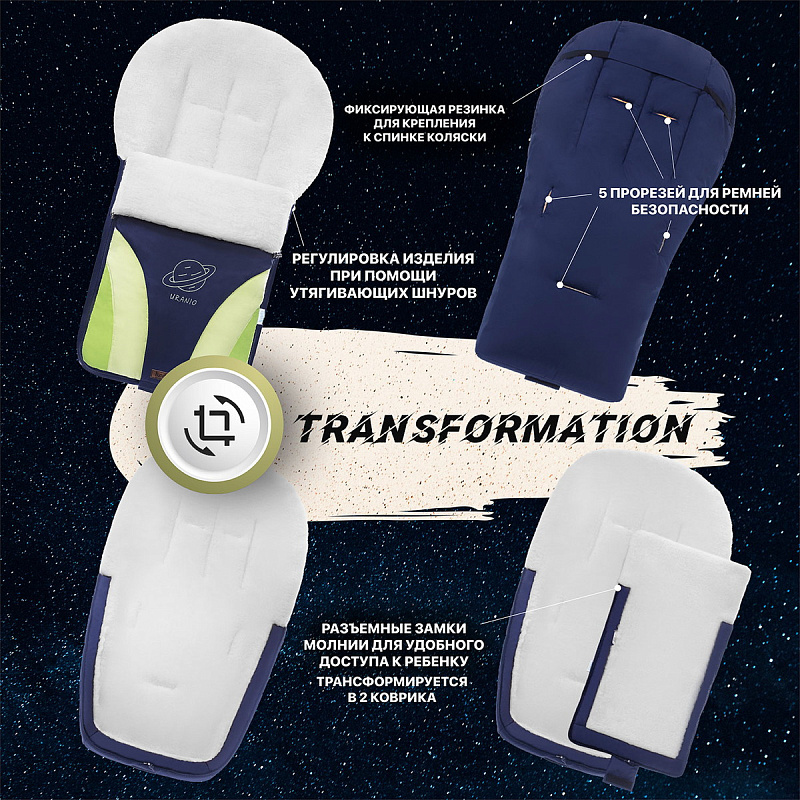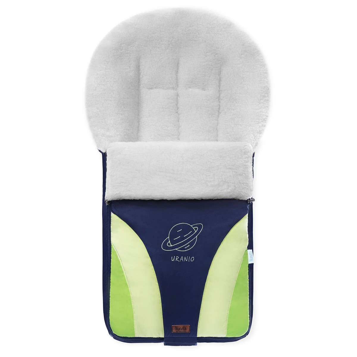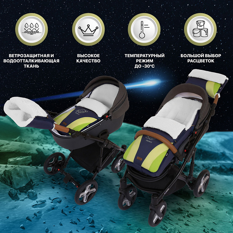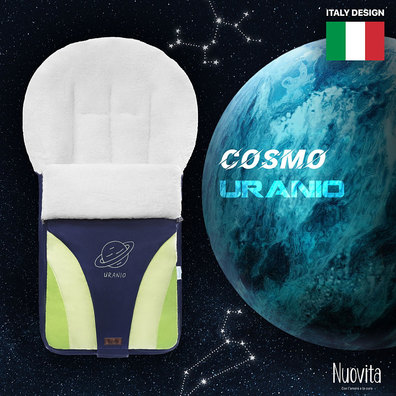 В полотне спинки имеются прорези, рассчитанные под пятиточечные ремни безопасности, а крепление за спинку сиденья коляски исключает сползание конверта во время прогулки. Полностью расстегнув конверт, можно получить коврик, который будет удобно использовать на прогулке или в машине. Детские меховые конверты серии NUOVITA COSMO предлагаются в 5 вариантах красочных цветовых сочетаний. Каждое изделие украшено вышивкой с изображением планеты и запоминающимся логотипом.