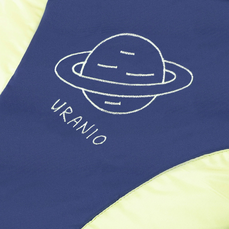 - Фурнитура: Две разъемные молнии "спираль", тип 5, в цвет верха , пластиковые зажимы, цветные шнуры-утяжки (по верхнему периметру), вшивные жакардовые этикетки с логотипом, составник. Вышивка "планета" в тематике космос