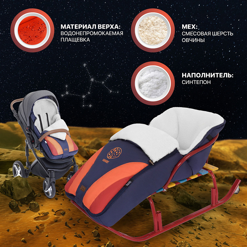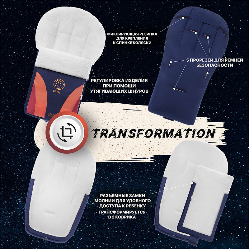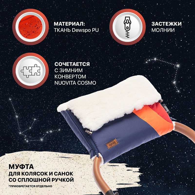 В полотне спинки имеются прорези, рассчитанные под пятиточечные ремни безопасности, а крепление за спинку сиденья коляски исключает сползание конверта во время прогулки. Полностью расстегнув конверт, можно получить коврик, который будет удобно использовать на прогулке или в машине. Детские меховые конверты серии NUOVITA COSMO предлагаются в 5 вариантах красочных цветовых сочетаний. Каждое изделие украшено вышивкой с изображением планеты и запоминающимся логотипом.
