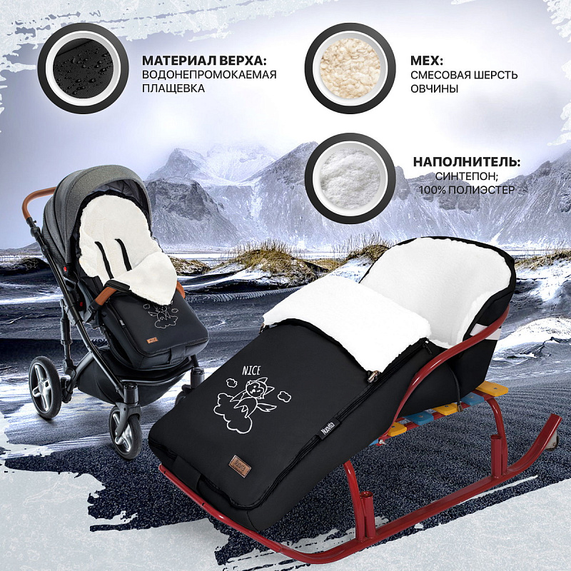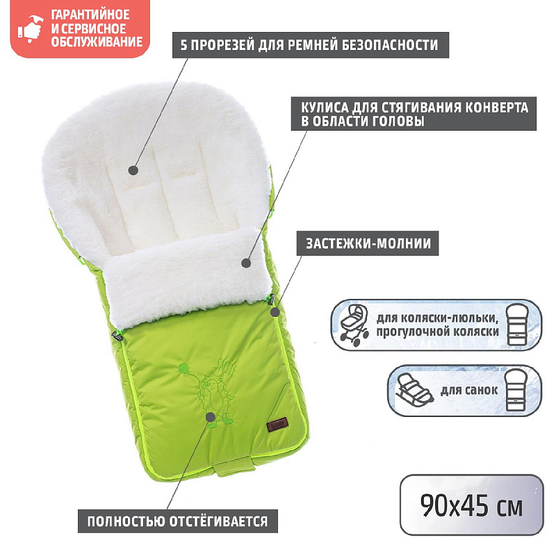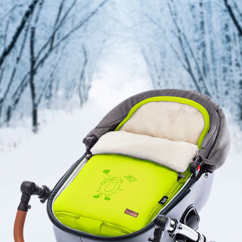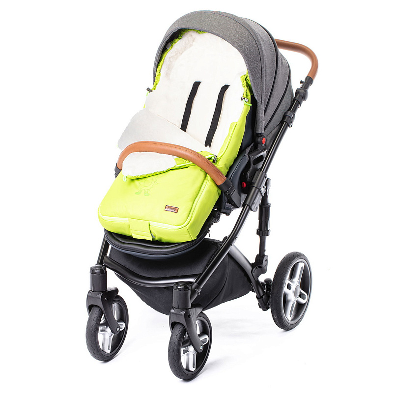 Основа конверта изготовлена из смесовой овечьей шерсти, что позволяет сохранять тепло в ветреные, снежные и морозные дни (до -30 градусов). Густой и мягкий мех обеспечивает оптимальную терморегуляцию и способствует комфортному сну ребенка, не допуская перегрева.