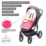 Чтобы конверт не сползал с сиденья прогулочной коляски, предусмотрена его фиксация на спинке при помощи накидного клапана. Отверстия для пятиточечных ремней безопасности дают возможность пристегнуть ребенка на время прогулки. Верх конверта можно регулировать при помощи шнура-утяжки, превращая его в капюшон.