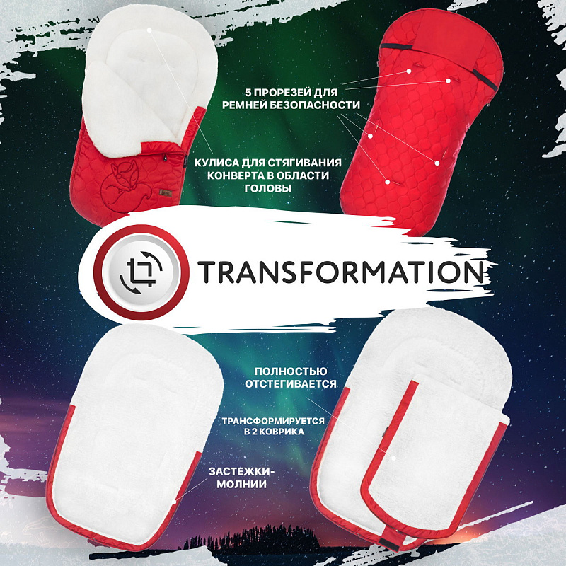 Конверт состоит из 2-х частей, соединенных разъемными замками с фиксаторами. Полностью расстегнув замки, можно получить одеяло или два меховых коврика, которые пригодятся впоследствии на прогулке или в поездках.