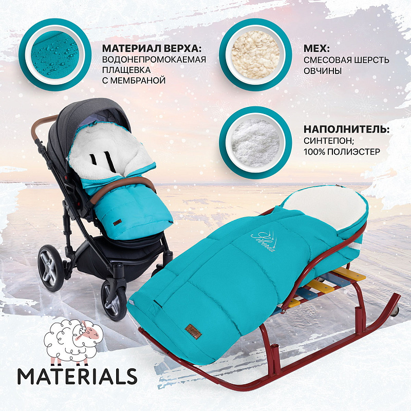 Лицевая часть изделия выполнена из мембранной PU-ткани, обладающей односторонней проницаемостью. Благодаря сочетанию шерсти и ткани с мембранной пленкой при продолжительных прогулках внутри конверта поддерживается оптимальный температурный режим. Водоотталкивающие свойства PU-материала облегчают уход, позволяя поверхности дольше оставаться чистой. Между чехлом и меховой основой находится мягкая прослойка из синтепона.