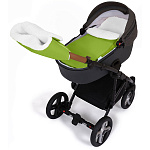 Спинка данной модели имеет прорези под пятиточечные ремни безопасности, что дает возможность надежно пристегнуть малыша в прогулочном блоке коляски. Чтобы конверт не сползал, он закрепляется на спинке сиденья накидным клапаном с широкой резинкой. Шнуры-утяжки дают возможность регулировать верхний периметр конверта, затягивая его наподобие капюшона.